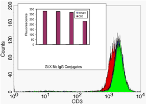 图2. 用胞外CD3抗体或同型对照抗体(BD Biosciences)分别标记Jurkat细胞,然后分别用偶联图中所示厂商荧光基团的羊抗鼠IgG二抗染色。插图显示的是用Beckman Coulter FC-500检测到的细胞计数的中位数荧光值。直方图显示的是非别用CF488A(绿色),AlexaFluor488(蓝色),DyLight488 Pierce(紫色)和DyLight488 KPL(红色)染色的CD3标记细胞,使用BD FACS Calibur 在FL1通道上检测。 |