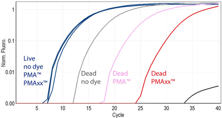 图3: PMAxx™ 和PMA™ 在检测死细菌和活性菌中的区别。